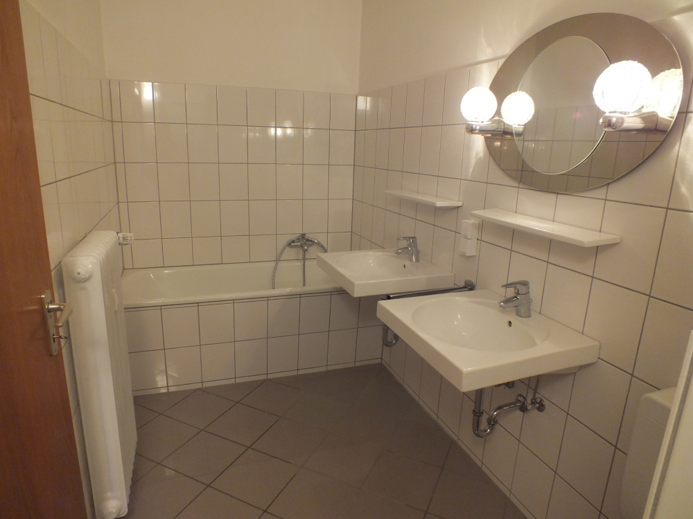 - großes Badezimmer mit Wanne, Dusche und zwei Handwaschbecken