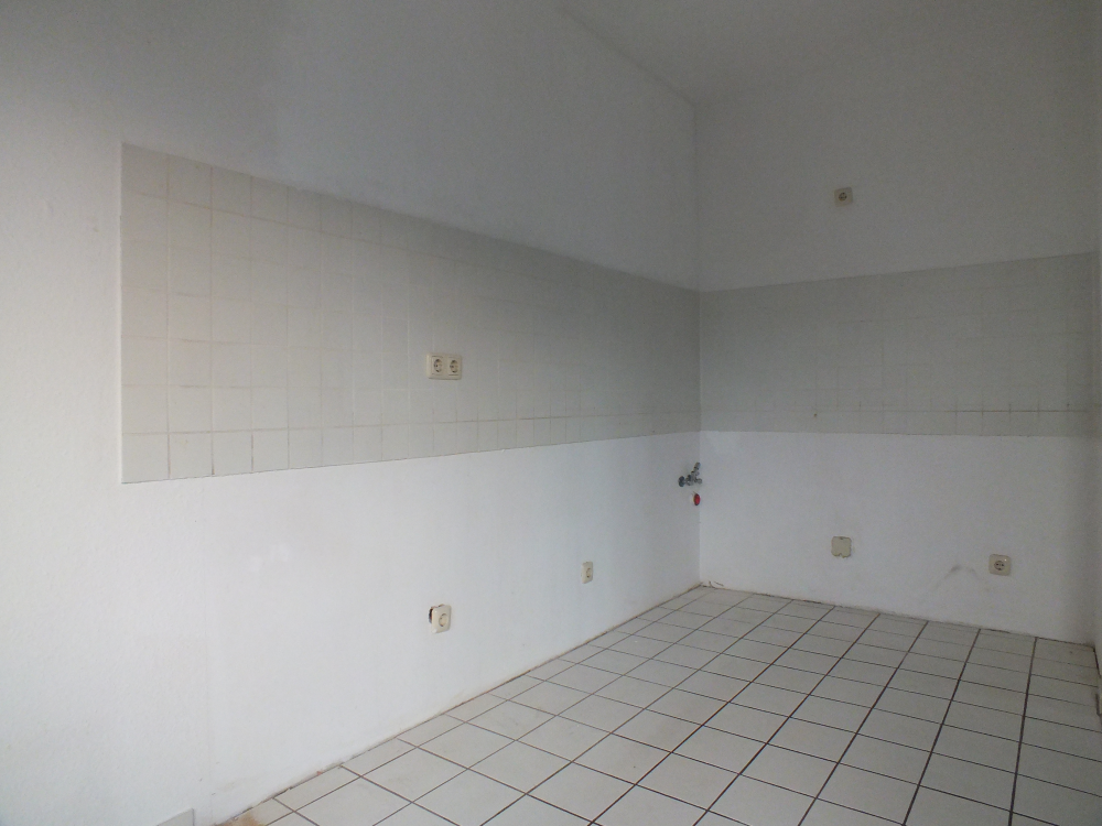 - Küchenboden mit weißen Fliesen, Fliesenspiegel ebenso weiß gefliest