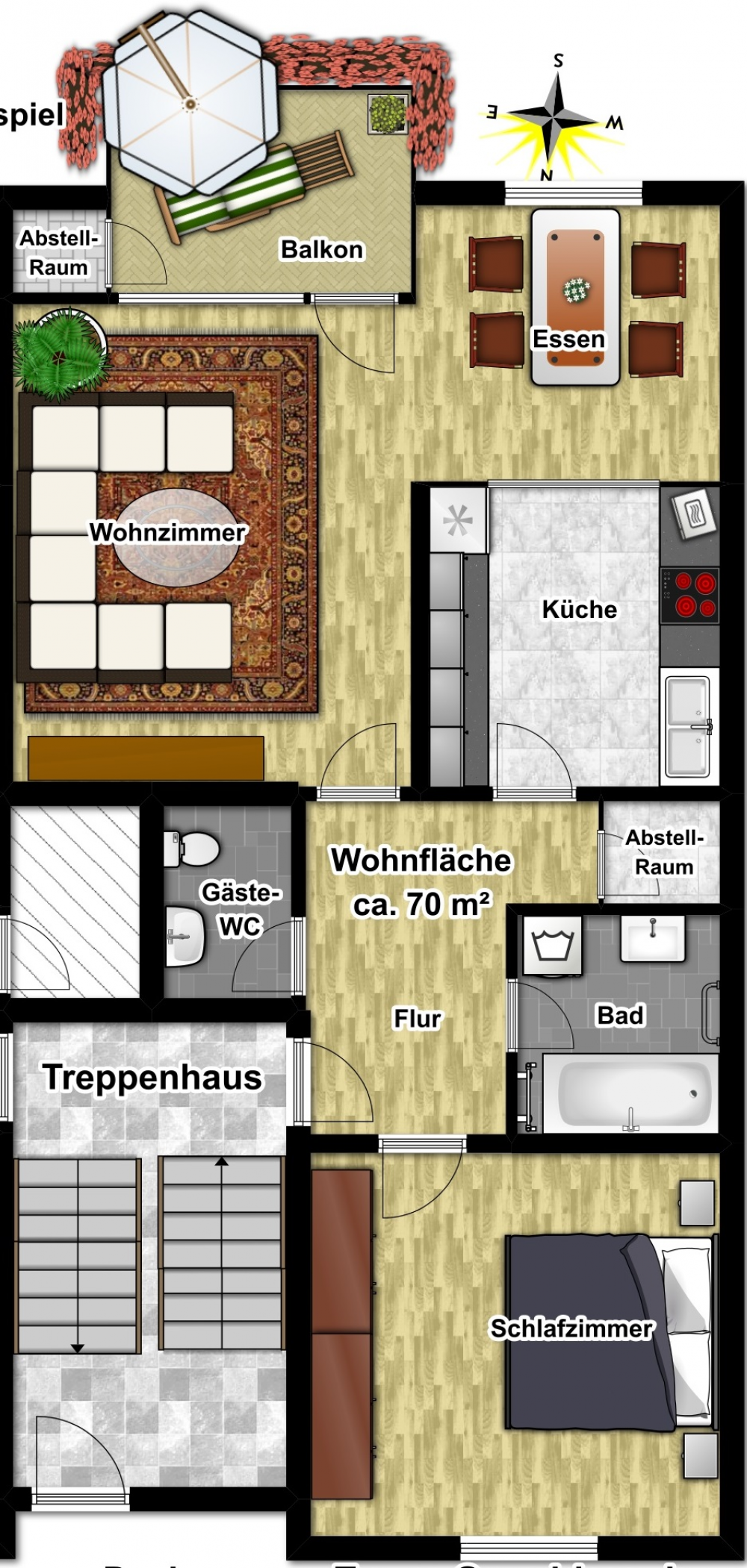 Die Wohnungen sind oder werden zur Zeit saniert und renoviert. Das Einrichtungsbeispiel soll Ihnen einen Eindruck über die Raumaufteilung der Wohnung vermitteln und welche Einrichtungsmöglichkeiten sich Ihnen bieten.