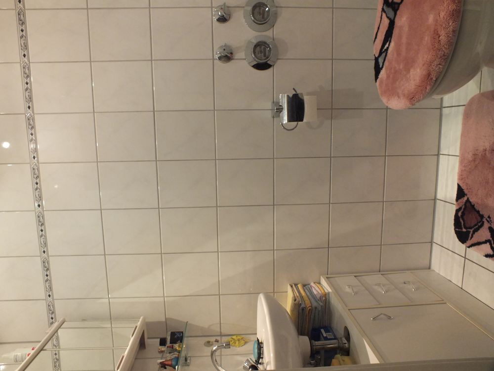 - Weiße Boden- und Wandfliesen im Badezimmer und WC