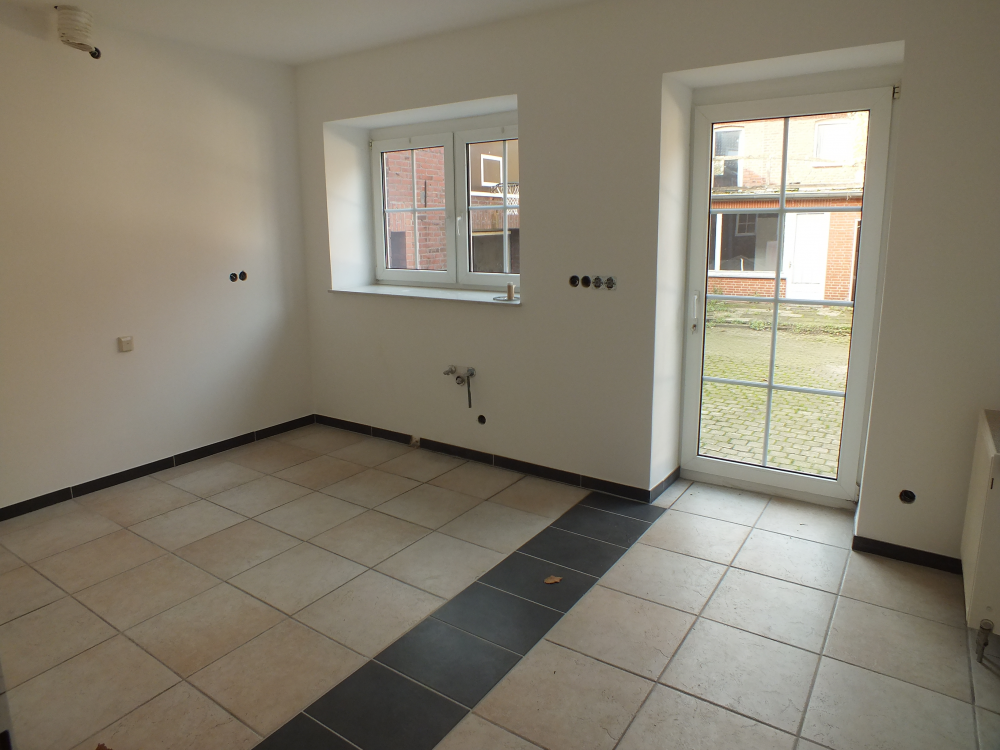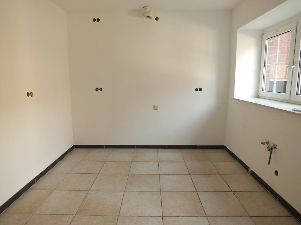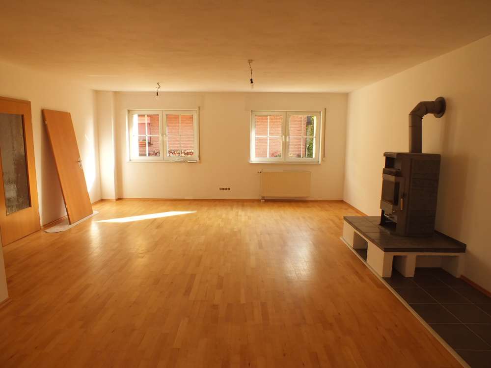 Die 5-Zimmer-Wohnung mit Terrasse auf dem Innenhof des Vierkanthofes liegt im Erdgeschoss. Sie ist im Wohnzimmer mit einem gemütlichen Kamin ausgestattet. Eine Küche mit Zugang zur Terrasse (über drei Stufen), vier weitere Räume, ein großes Tageslichtbad mit Badewanne & Dusche sowie ein Gäste-WC bieten reichlich Platz.