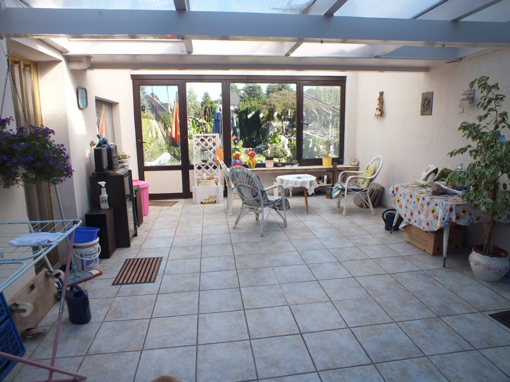 Die Erdgeschosswohnung umfasst ca. 113 m² Wohnfläche zzgl. weiterer Nutzflächen (großer Wintergarten, Partyraum im Untergeschoss, Werkstatt, Waschküche, Vorratsraum, Abstellraum) Begehbar ist die Erdgeschosswohnung über den Wintergarten oder direkt von der Garage, welche ebenfalls einen Zugang zum Wintergarten besitzt.