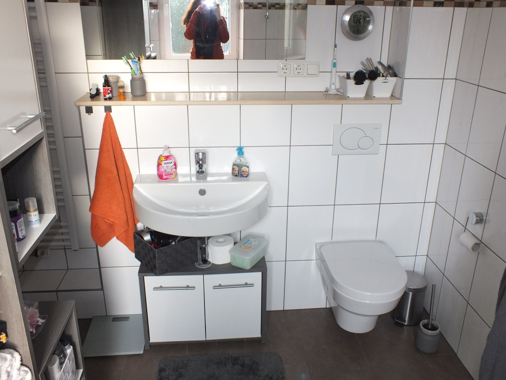 - Weiße, großformatige Wandfliesen im Badezimmer mit Mosaikbordüre