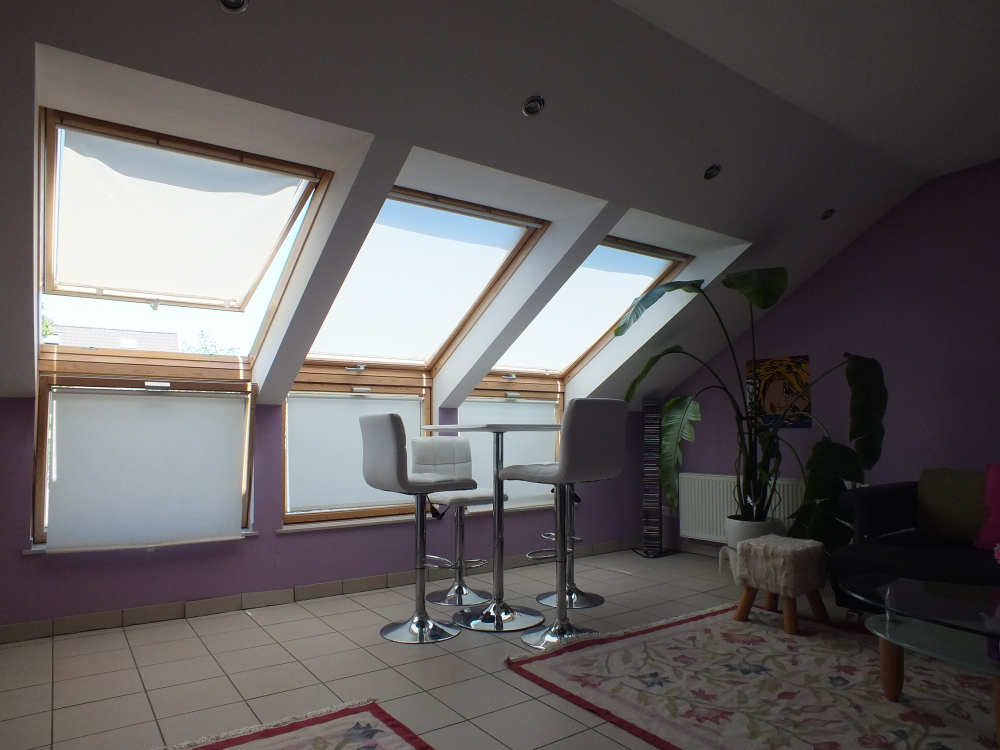 Durch einen kleinen Flur gelangen Sie in alle Räume der Wohnung. Das großzügige Wohnzimmer mit moderner, offener Küche ist durch seine 6 großen Veluxfenster sehr hell und ansprechend. Alle Veluxfenster sind mit Jalousien ausgestattet. Das Wohnzimmer verfügt über eine moderne Schlafcouch mit Couchtisch, ein großes weisses Sideboard und einen Bartisch mit 4 Hockern.