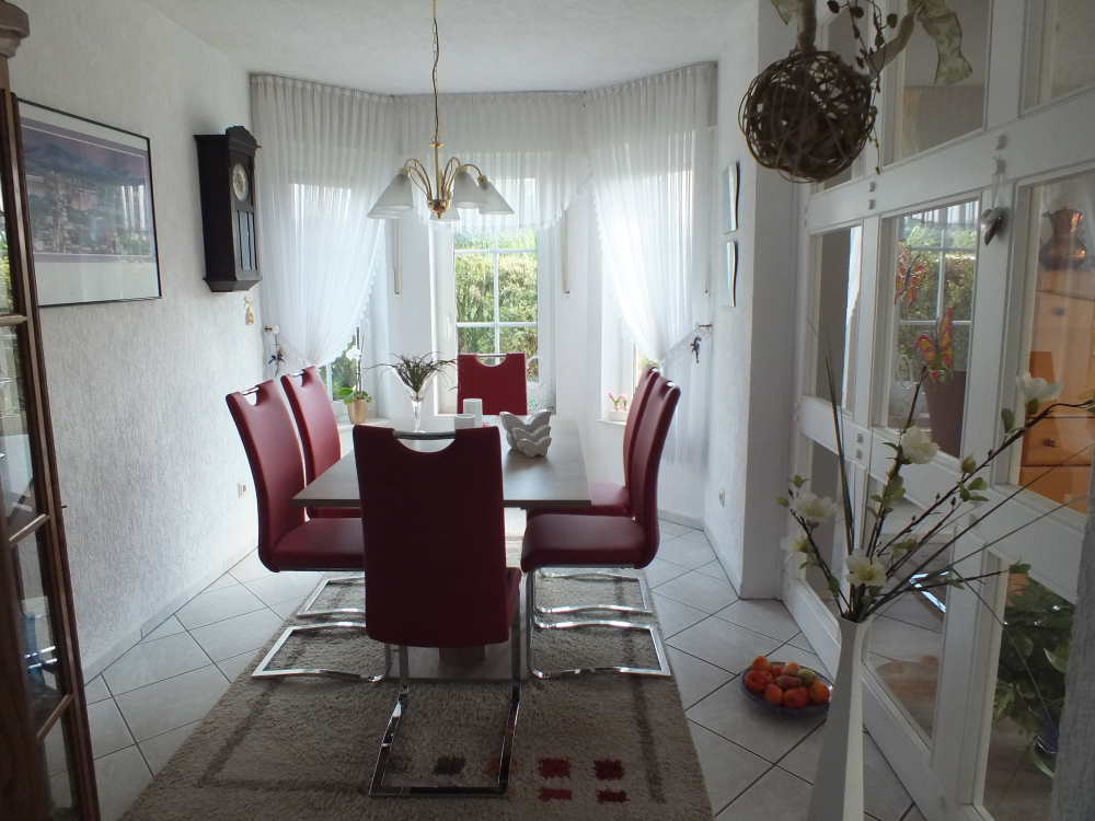 Sie betreten das Haus über den Dielenbereich mit Garderobenecke und Zugang zum Gäste-WC. Im Flur führt eine Treppe mit Holzsprossen in das Unter- und Obergeschoss. Von der Diele aus ist das Erkerzimmer, das Wohnzimmer sowie die Küche mit integriertem Abstellraum begehbar. Im Wohnzimmer spendet ein gemütlicher Kamin natürliche Wärme. Das Wohn- und Erkerzimmer, welches derzeit als Esszimmer genutzt wird, sind durch eine Glasspossenwand separiert. Vom Wohnzimmer erreicht man die großzügige Terrasse. Ein schön angelegter Garten schließt sich an.