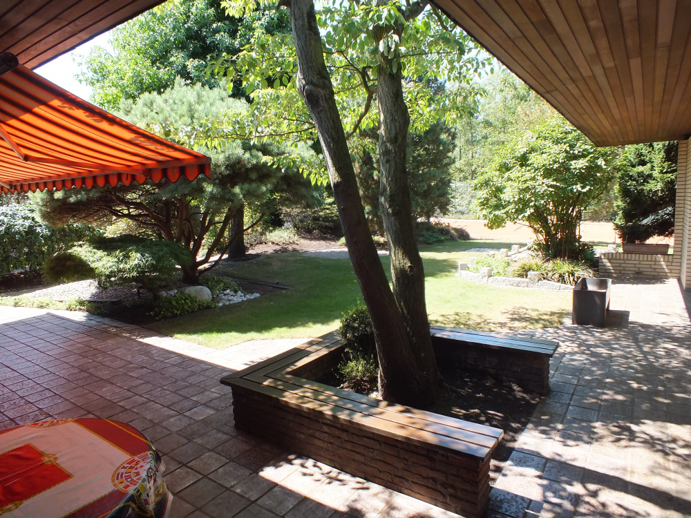 Der teilunterkellerte Bungalow wurde ebenfalls in massiver Bauweise errichtet. Der pflegeleichte Garten mit altem Baumbestand, einer großzügig gefliesten Terrasse und schön angelegten Steinbeeten befindet sich in Südwestlage. Für Liebhaber des Tennissports steht ein eigener Tennisplatz mit Randdrainage und Besprühung zur Verfügung. Diese Fläche ist alternativ teilweise bebaubar. An einer 400 qm öffentlichen Grünfläche, welche direkt an dieses Grundstück grenzt, besteht ein unentgeltliches Nutzungsrecht.