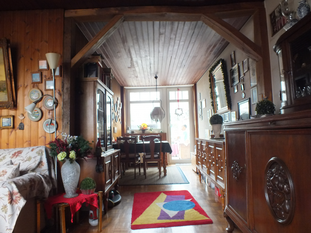 Die Wohnung im Erdgeschoss besteht aus Wohnzimmer, Esszimmer, 2 Schlafzimmern, Küche, Diele, Dusch- und Wannenbad. Das WC ist separiert vom Badezimmer. Wohn- und Esszimmer sind derzeit miteinander verbunden, es können jedoch bei Bedarf wieder zwei Räume entstehen. Ein großer Raum im Kellergeschoss bietet ausreichend Tageslicht, um ggfs. einen weiteren wohnlich genutzten Raum zu schaffen. Besonders hervorzuheben ist der große Wintergarten (34m²) mit Kaminofen und Zugang zum Untergeschoss in den Hauswirtschaftsraum.