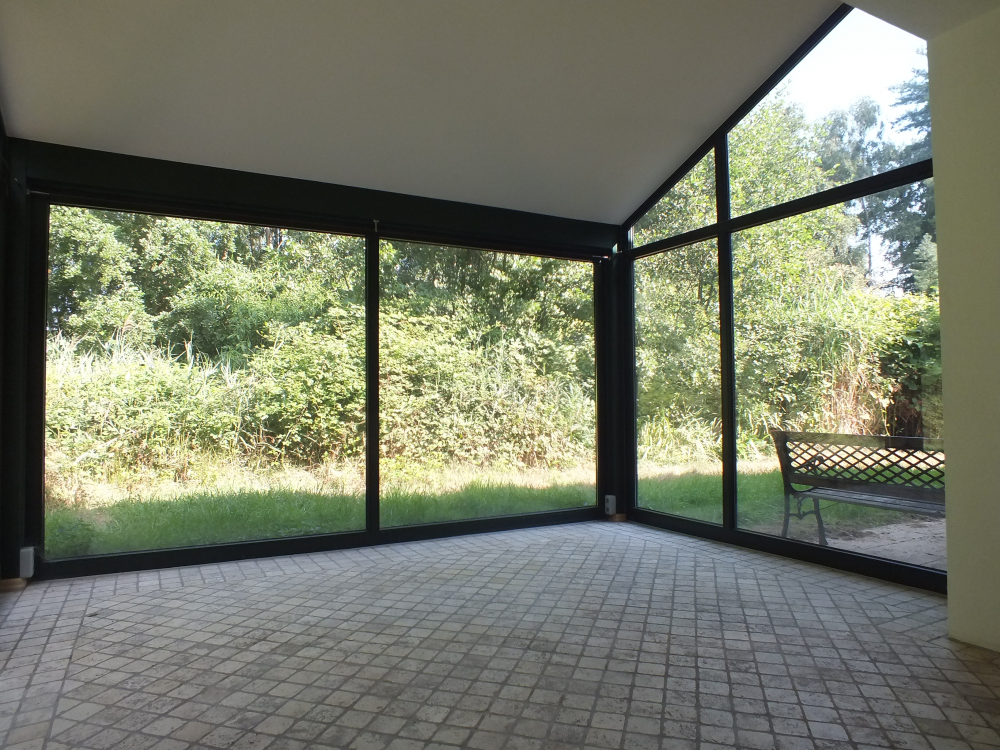 - Fenster mit Holzrahmen inkl. Rolläden aus Holz, große Fensterfront im Anbau doppeltverglaste Isolierfenster