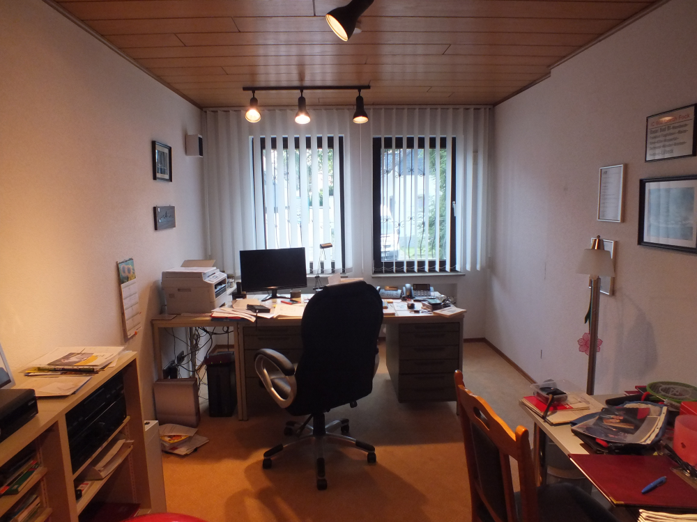 Jeweils vom Wohnzimmer und von der Küche aus sind Terrassen begehbar. Die Sonnenterrasse ist mit entsprechenden elektrischen Markisen ausgestattet. Auf Erdgeschossebene befindet sich die Diele, ein Gäste-WC, die Küche (die Einbauküche kann übernommen werden und ist im Mietpreis enthalten), das großzügige Wohn- und Esszimmer sowie ein separater Trakt, welcher ein Schlafzimmer, ein Duschbad sowie ein weiteres Zimmer, zuletzt als Büro genutzt, beherbergt. Dieses Zimmer kann ebenso als weiteres Schlafzimmer genutzt werden. Sollte ein Büro benötigt werden, könnte hier ein eigener Außenzugang hergestellt werden. Das Obergeschoss bietet zwei weitere Schlafzimmer und ein Tageslichtbad mit Badewanne und Dusche.