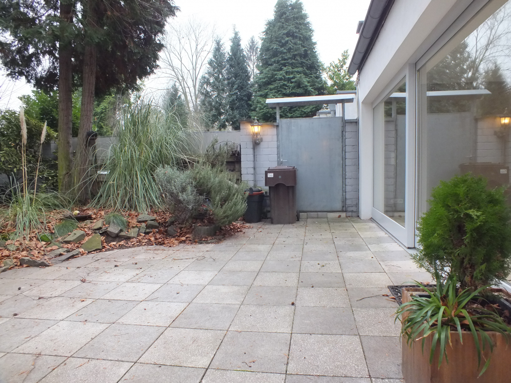 Die sich an die Wohnung anschließende Terrasse ist blickgeschützt. Im Sommer genießen Sie durch den Baumbestand auch im hinteren Bereich einen komplett blickgeschützten Garten.