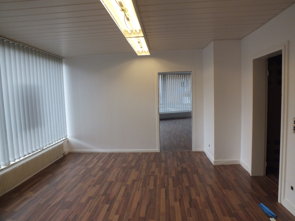 Es steht ein großer und ein kleinerer Raum zur Verfügung. Auf Wunsch kann hier mieterseitig ein Wanddurchbruch vorgenommen werden. Eine Teeküche mit Spüle, großem Einbauschrank und Fenster bietet Platz für die Mittagspause und/oder zur Lagerung. Über den Hausflur ist das Damen- und Herren WC zu erreichen. Im Vorraum der Toilette ist ein kleiner Abstellraum für z.B. Reinigungsutensilien vorhanden.