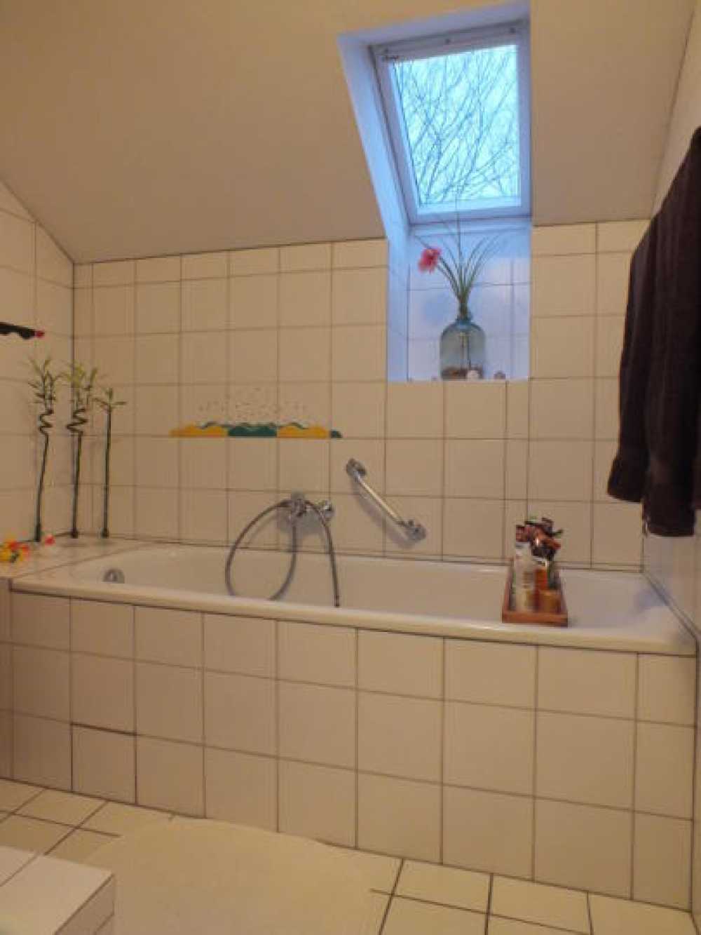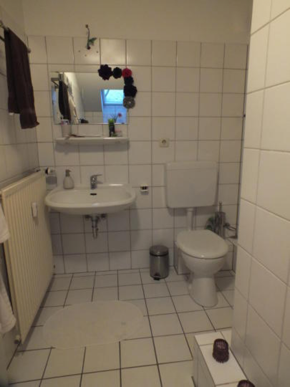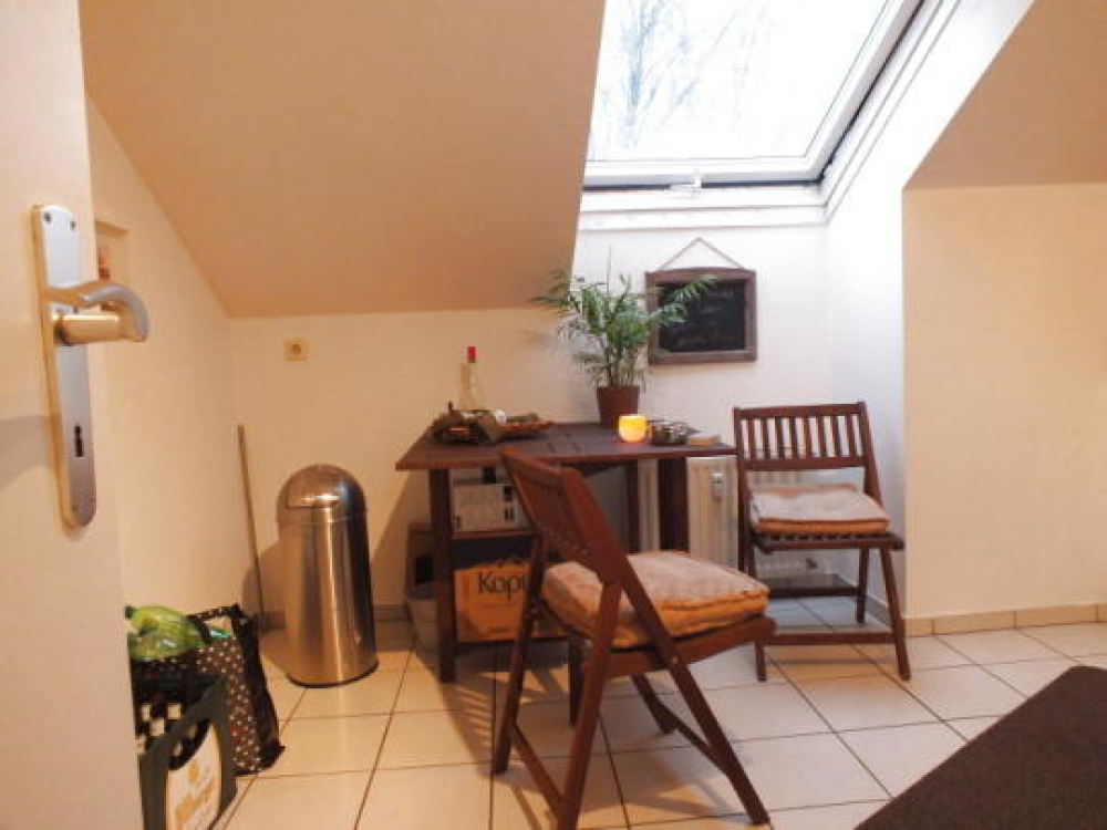 Gemütliche Dachgeschosswohnung in sehr ruhiger und schöner Wohngegend von Krefeld. Optimal für ein Paar oder einen Single. Die Aufteilung ist wie folgt: Vom Hausflur betreten Sie direkt das große, helle Wohnzimmer. Von hier erreichen Sie die weiß geflieste Küche mit großem Dachfenster und Platz für eine kleine Essecke. Das Schlafzimmer erreicht man ebenfalls vom Wohnzimmer aus. Es bietet ausreichend Platz für ein Doppelbett und einen großen Kleiderschrank. Im Schlafzimmer ist der Zugang zum Badezimmer und einem zusätzlich integriertem Raum in der Dachschräge. Das Tageslichtbad verfügt über eine Badewanne, hat weiße Boden- und Wandfliesen und bietet diverse Ablageflächen. Die Handtuchhalter können bei Bedarf übernommen werden. Der zusätzliche kleine Raum in der Schräge kann idealerweise als Abstellraum genutzt werden. Der Gemeinschaftswaschraum, ein Raum zum Wäschetrocknen sowie Platz für Fahrräder findet sich im Keller. Vor dem Haus stehen den Mietern kostenfreie PKW-Stellplätze zur Verfügung.