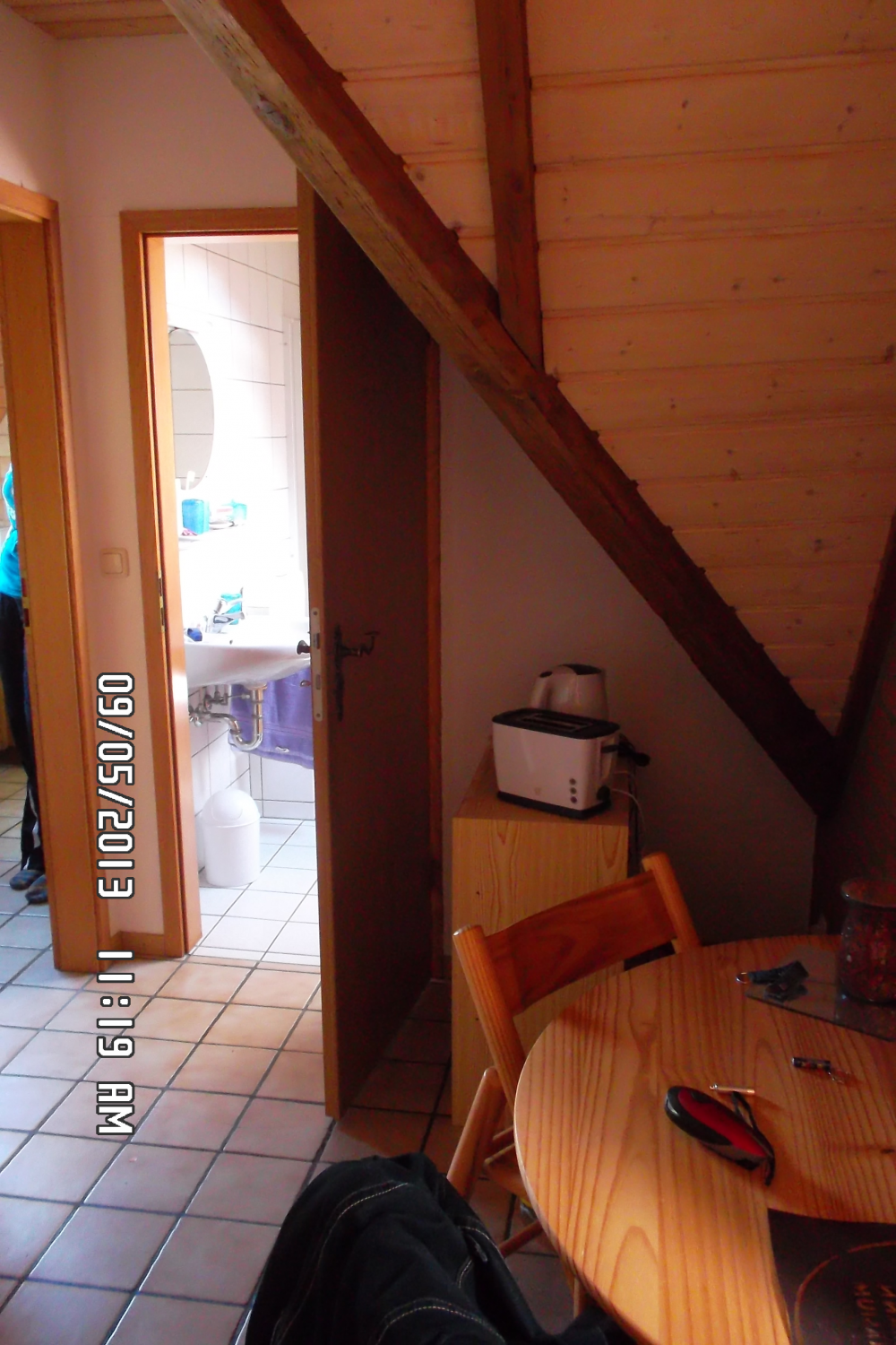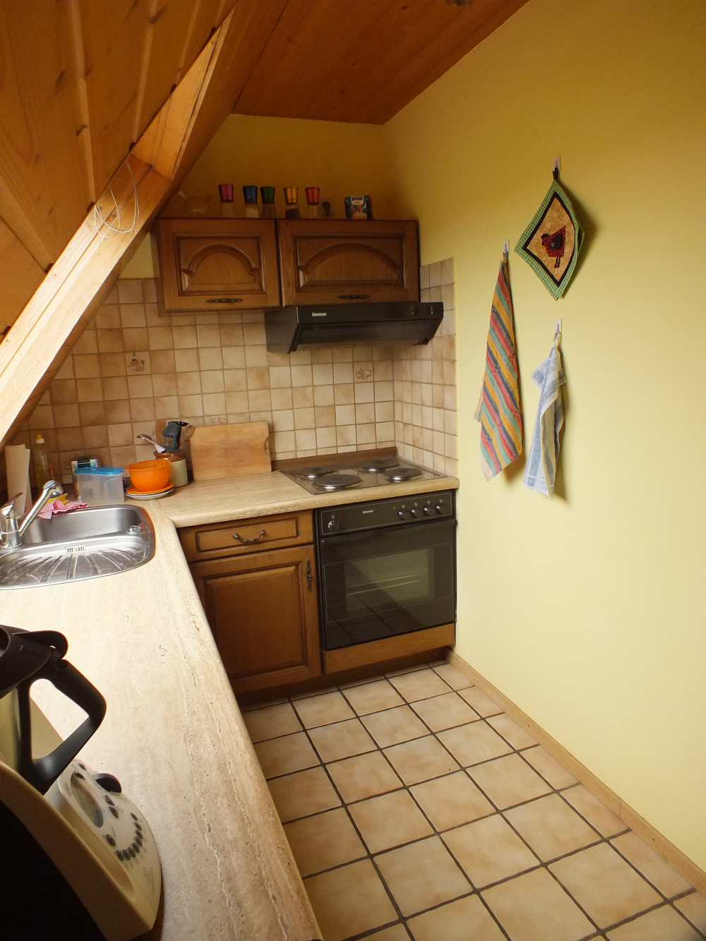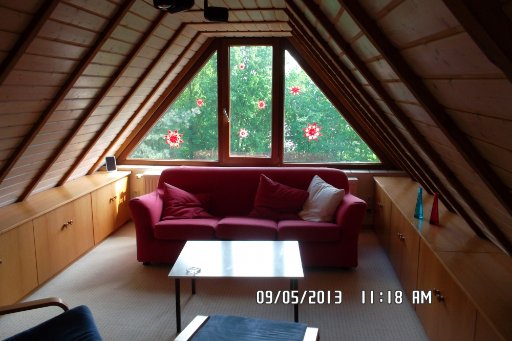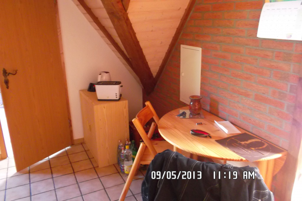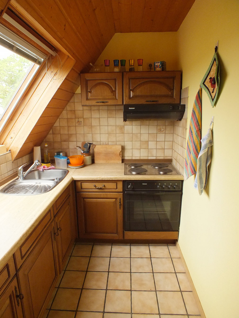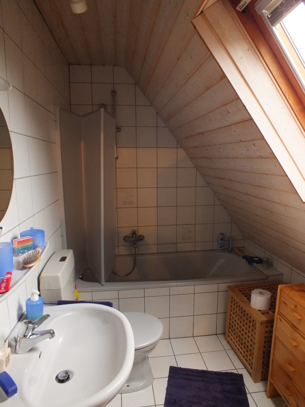 Das Tageslichtbad ist hell gefliest, an der Badewanne ist eine Duschtrennwand. Hier befindet sich auch der Waschmaschinenanschluss. Ein Abstellraum innerhalb der Wohnung schafft zusätzlichen Stauraum. Wandverkleidungen aus Holz innerhalb der Dachschrägen geben der Wohnung seinen eigenen, gemütlichen Charakter.